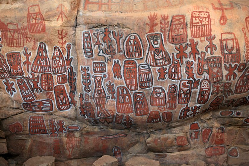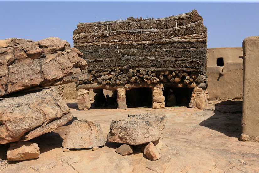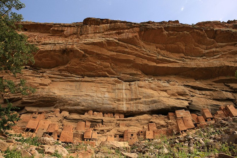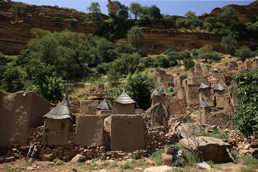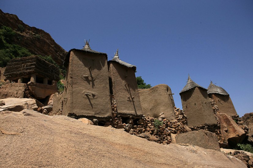 Les Dogons vivent dans une région nommée « pays Dogon » qui s’étend de la falaise de Bandiagara jusqu’au sud-ouest de la boucle du Niger. Les Dogons sont avant tout des cultivateurs, ils sont réputés pour leur cosmogonie et leurs sculptures. L’architecture Dogon est très spécifique, La plupart des villages sont implantés dans la falaise et accessibles en empruntant des chemins escarpés qui empruntent les failles des plateaux. La case traditionnelle est organisée autour d’une cour . Homme et femme ont des greniers séparés et identifiables. Celui du mari sert à conserver le mil, celui de la femme, les condiments et différents objets de la vie quotidienne.