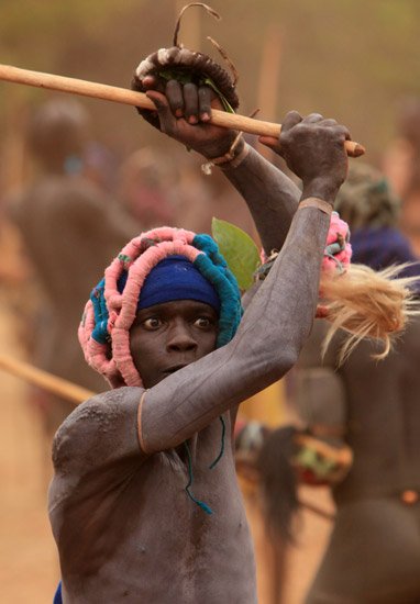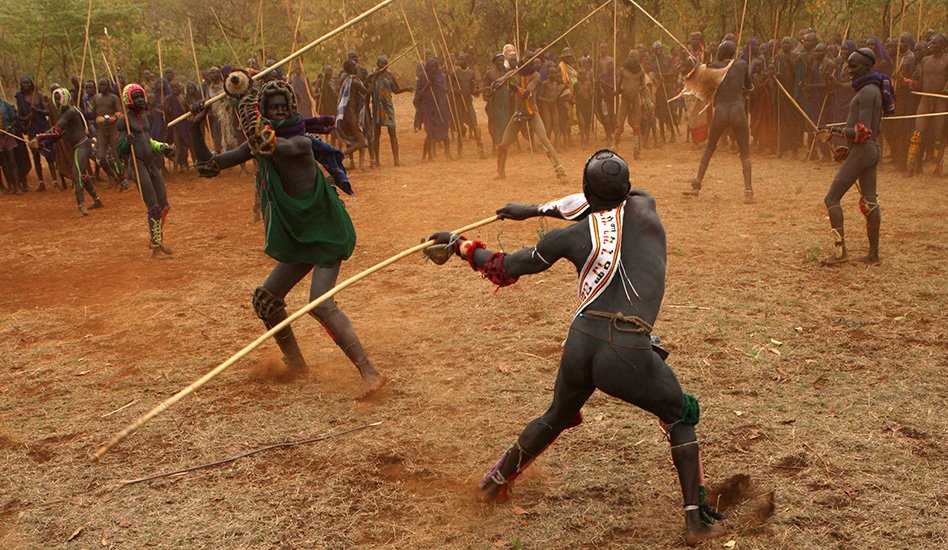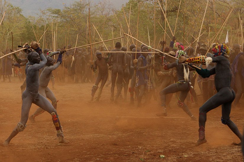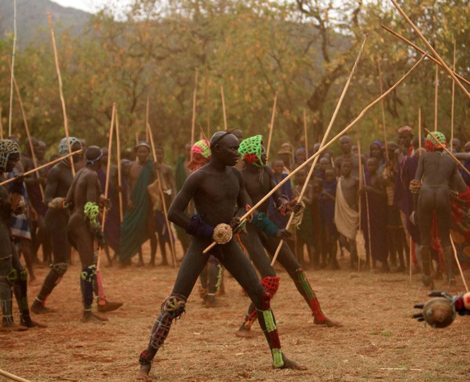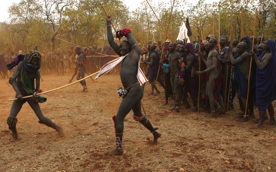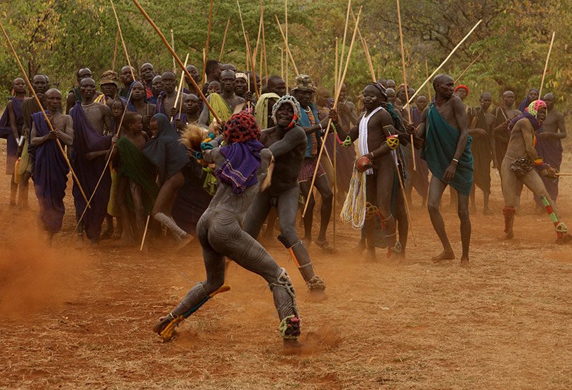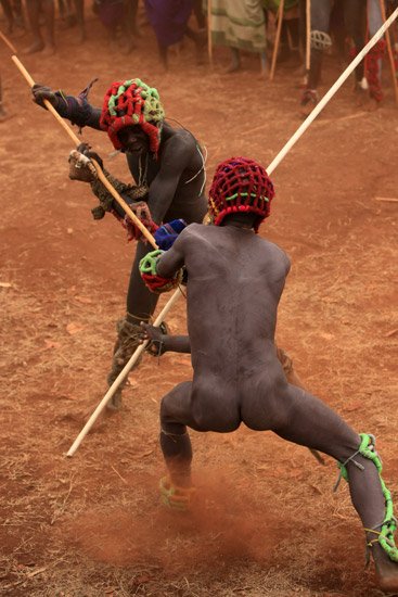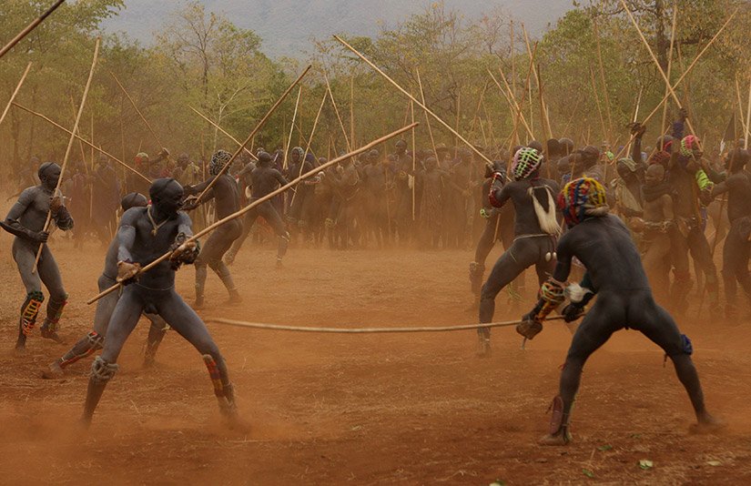Le Donga est une lutte traditionnelle du peuple Surma dans la vallée de l’Omo dans le sud de l’Ethiopie qui se pratique après les moissons et marque la fin des récoltes mais aussi pour régler des conflits entre villages. Les corps des combattants sont enduits de peintures ornementales, les participants se protègent les parties du corps les plus exposées avec des fibres végétales tressées et se munissent d'un bâton d'environ deux mètres. Les combats qui sont d’une extrême violence opposent deux adversaires mais de très nombreux combats peuvent avoir lieu au même moment. Les coups sont portés avec le bâton. Le combat s'arrête si un bâton casse ou à la demande d'un des participants. Les blessures sont souvent très sérieuses et parfois mortelles ! Les combats ne sont pas obligatoires, mais le prestige social apporté aux participants pousse les hommes à s'y présenter et permettent de montrer force et courage aux femmes.