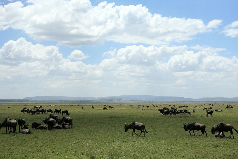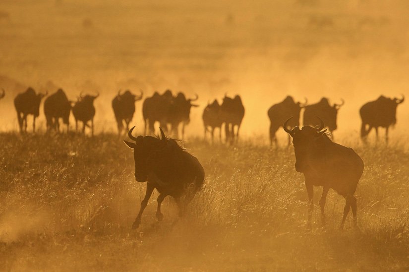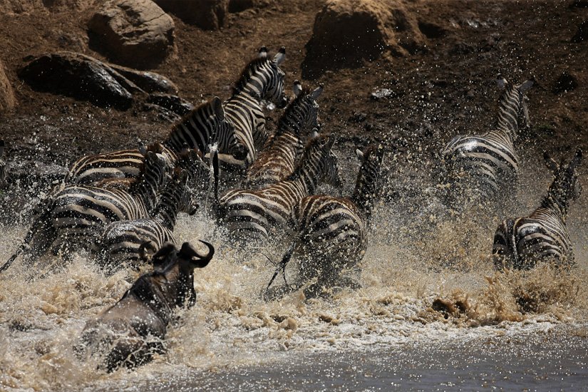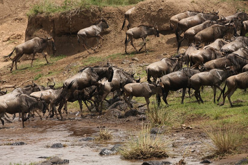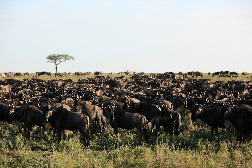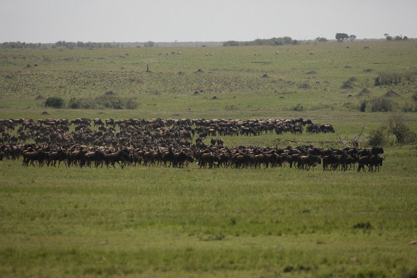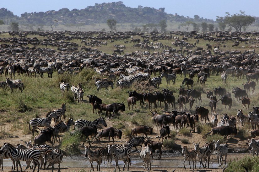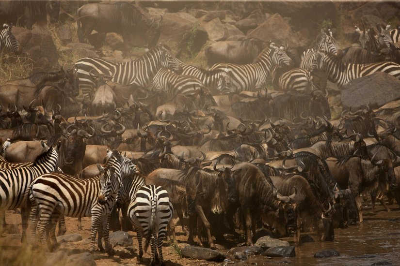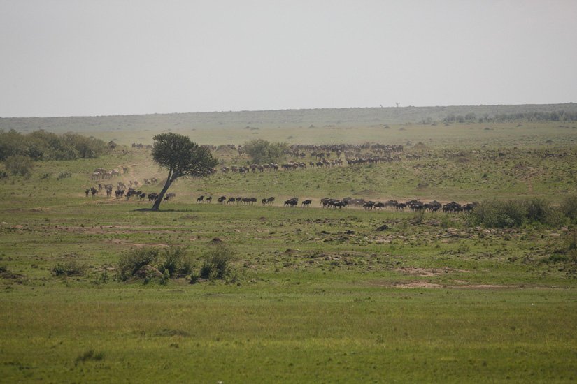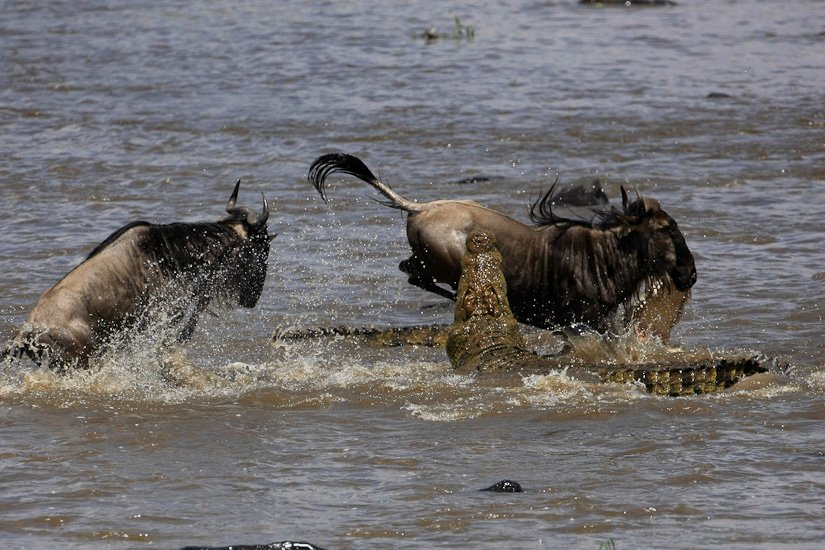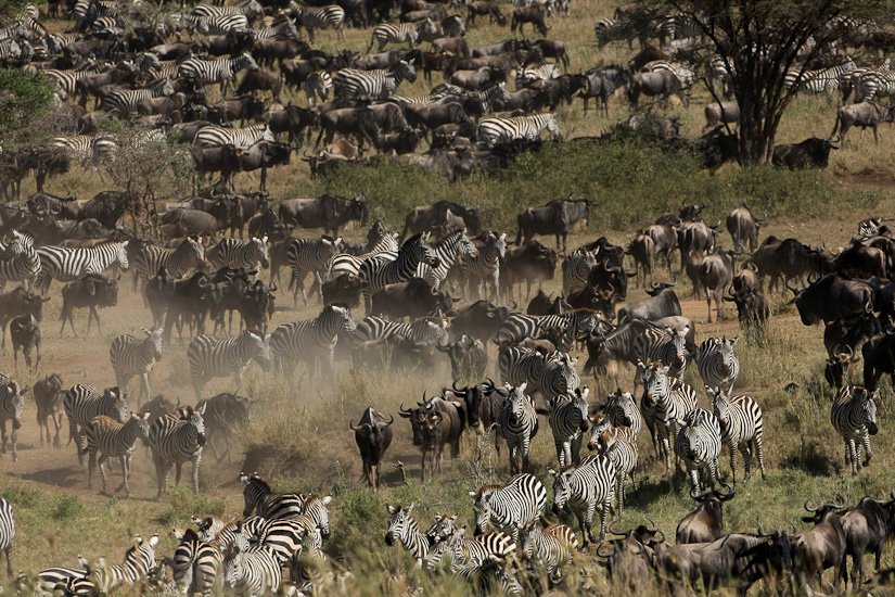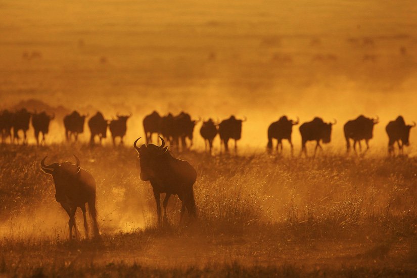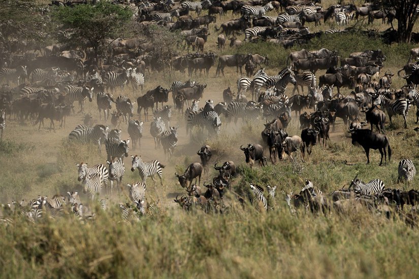 La grande migration des gnous et des zèbres est un des spectacles les plus impressionnant que la nature peut encore offrir ! Des plaines du Serengeti à celles du Massai Mara, des centaines de milliers d’herbivores migrent pour de meilleurs pâturages en fonction des saisons et des pluies. Il est impossible de décrire ce spectacle où 1,7 million de gnous, 250 000 zèbres des centaines de milliers de gazelles et des dizaines de milliers d’élans se déplacent ensemble suivis par les prédateurs (lions guépards, léopards hyènes…), attendant la moindre opportunité pour profiter du festin ! En colonnes pouvant atteindre 40 kms de long la migration va accomplir un périple annuel de près de 3000 kms.