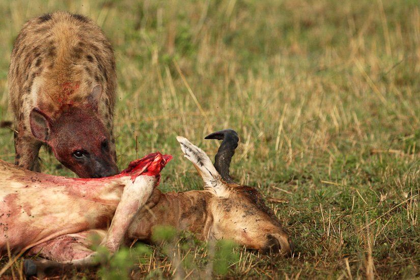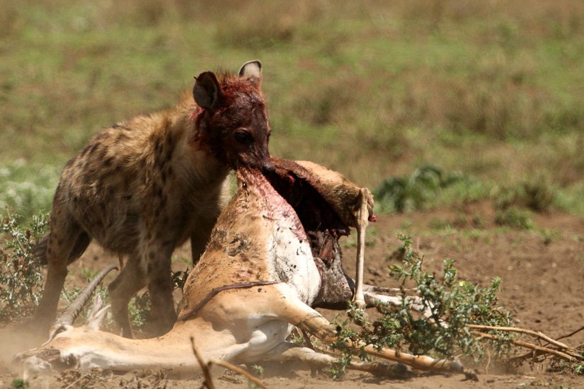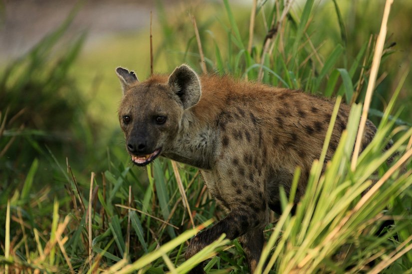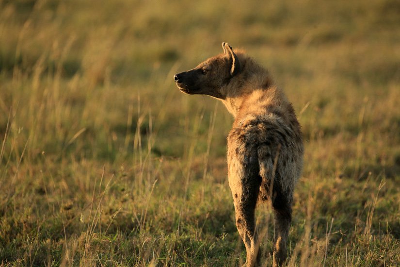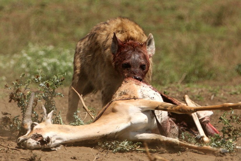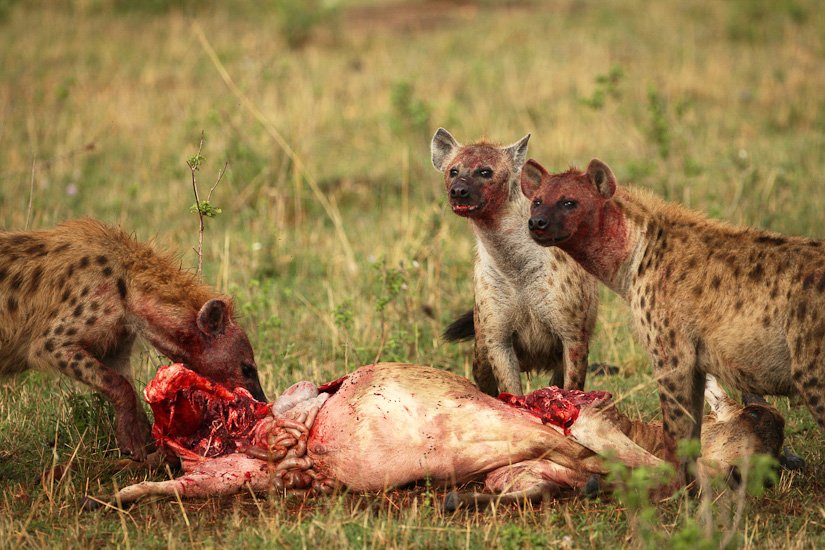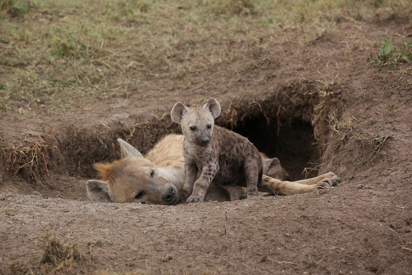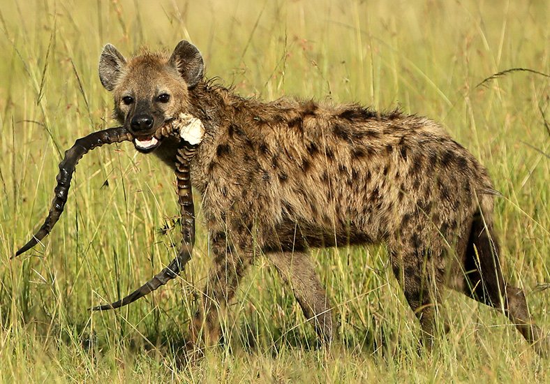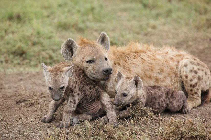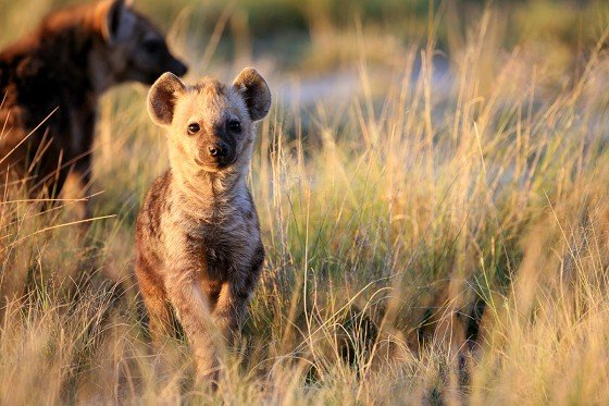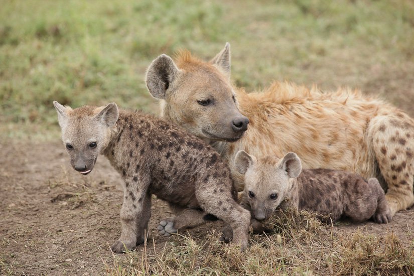 La société des hyènes est matriarcale, la femelle y est toujours plus grande et plus forte que les mâles, elle possède des caractéristiques physiques particulières, notamment un clitoris érectile qui rend la distinction entre mâle et femelle pratiquement impossible. La femelle domine un groupe, qui peut varier entre 5 et 50 adultes. La domination de la femelle est héréditaire. Elle donnera naissance à une future dominante. Souvent réputée être un charognard, elle est en fait un prédateur très efficace appartenant à un système social très évolué. Elle peut courir à une vitesse de 60 km/h sur de très longues distances et en meute elle peut s’attaquer à des zèbres ou des gnous adultes. Son cri que l’on entend pendant la nuit est un des plus distinctif d’Afrique.